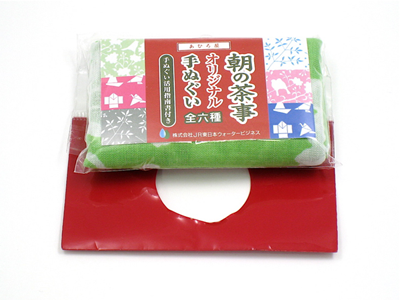 飲料品についているオマケ「オンパック」のデザインです。手ぬぐいデザイナーの方に手ぬぐいデザインをしてもらいお茶に合う手ぬぐいを制作。手ぬぐいによるペットボトルに使える巻き方の手引書を同梱しました。手ぬぐいは持っていてオシャレな柄と現代的な色使い。パッケージは和的な表現をし、製品とのバランスをとりました。